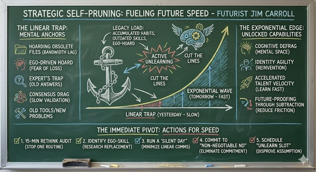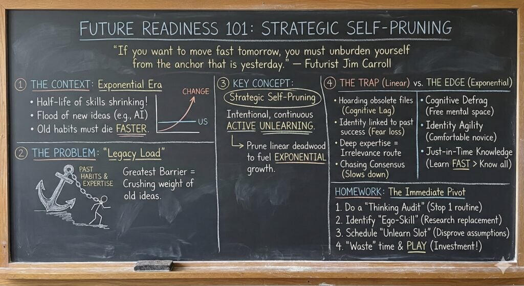 Practice “strategic obsolescence“: Your skills and knowledge are going out of date faster than you know. Gain the courage to intentionally shed past successful skills, assumptions, and commitments before the future forces you to. You become the architect of your own career, constantly getting rid of the old to make room for the exponential new.