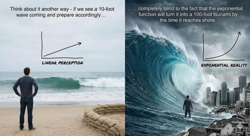 Opportunity Blindness: Exponential change always starts small, looking like a “toy” or a fringe idea (e.g., the internet in 1995, early GenAI). Linear thinkers dismiss it because it’s not a major factor yet. Exponential thinkers invest and experiment because they know the explosion is imminent.
