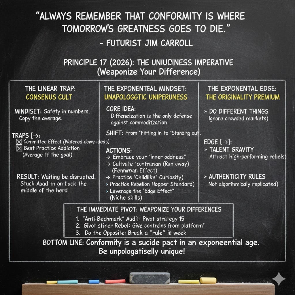 In a way, as powerful as it is, AI takes us on a race to the bottom where everyone and everything is average. How do you stand out?If your output is merely “good enough,” you are now competing with a machine that can do “good enough” for free.The trend is clear: Average is common.The market only rewards the unique, the bold, and the human.3. The Opportunity: Radical UniquenessThis is where the concepts in Escaping Mediocrity become your survival guide.When everyone else is mediocre, you need to escape it. You need to be unique. You need to stand out.The fact is, the only way to survive the acceleration of mediocrity is to double down on what makes you unique!We are living in a world where the instant eat the hesitant. But do not mistake “fast” for “good.” The tools of tomorrow will let you build anything instantly.That means the only competitive advantage left is your ability to stand out.To do that, you must align with the four pillars of the exponential age. Here is your 50-point checklist for escaping the gravity of the average.#1: DON’T BE AVERAGESmall thinking is a liability. You must collapse time, leverage AI, and refuse to accept linear limitations.For the Business: