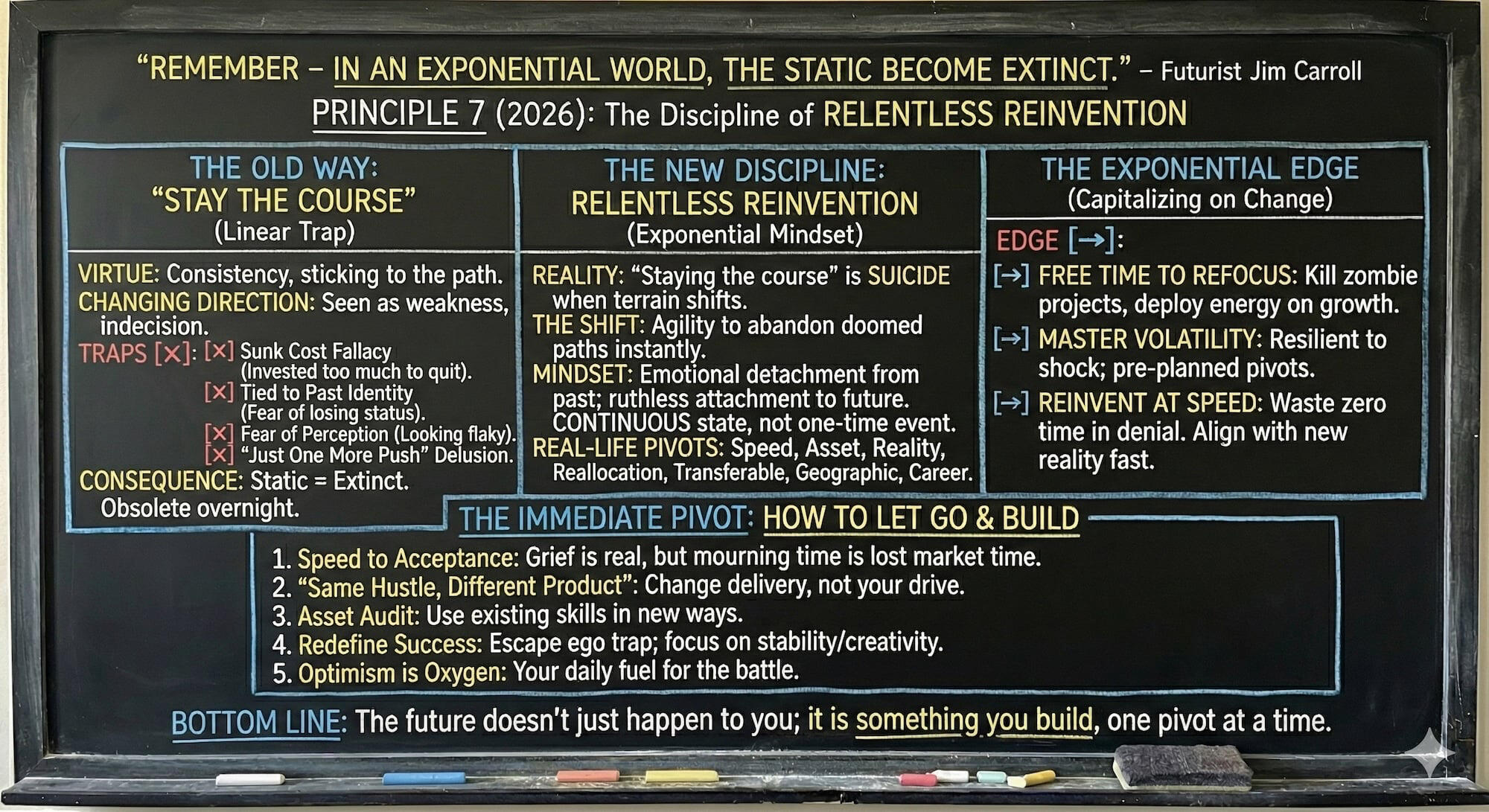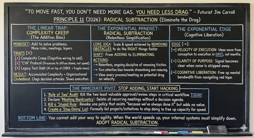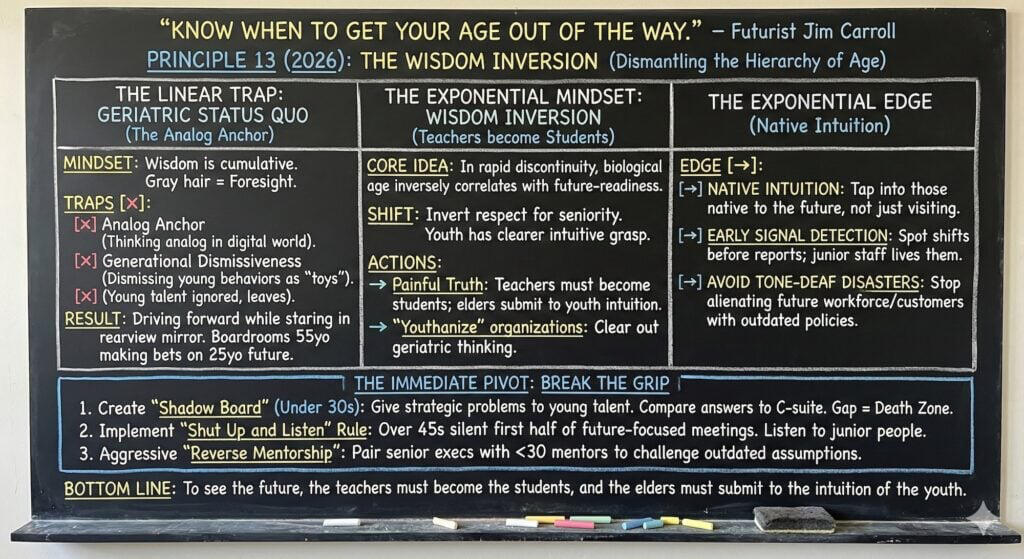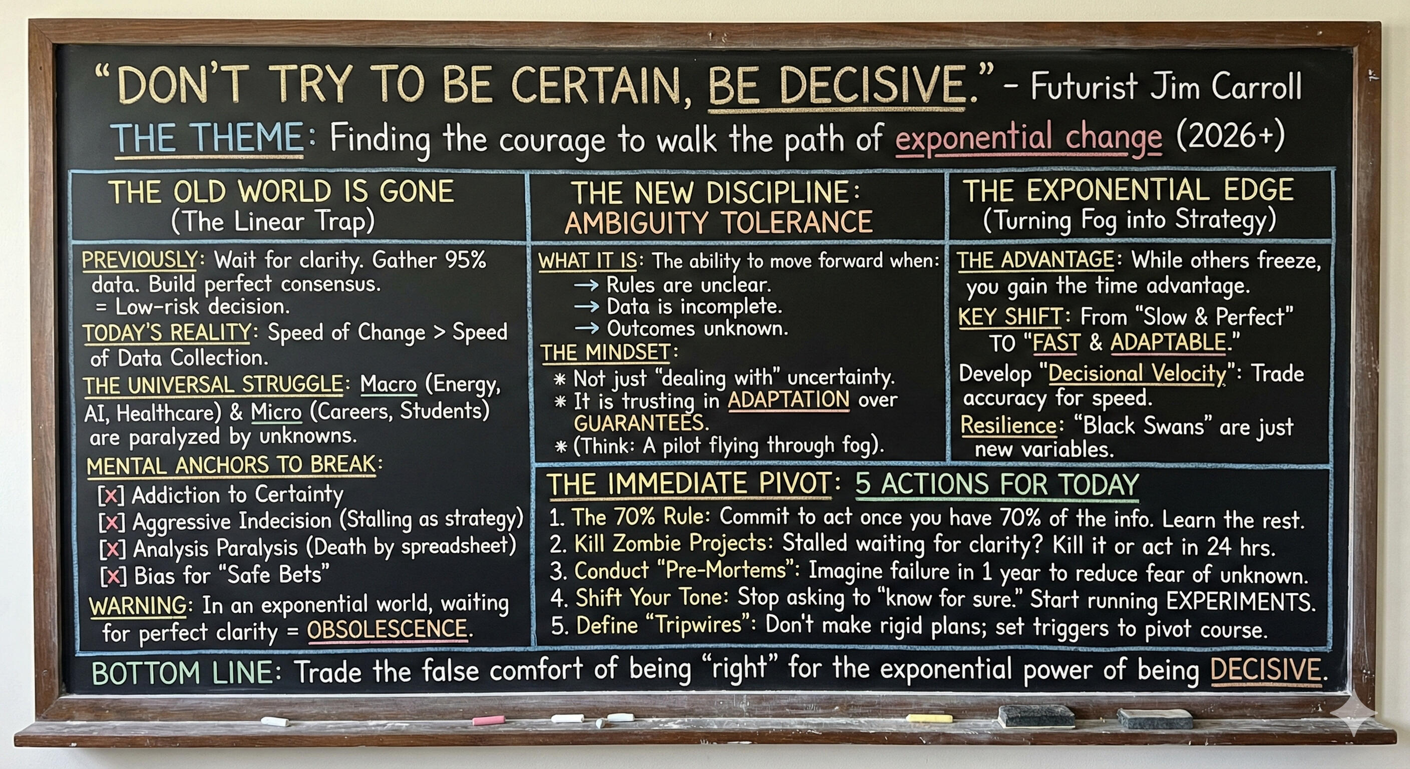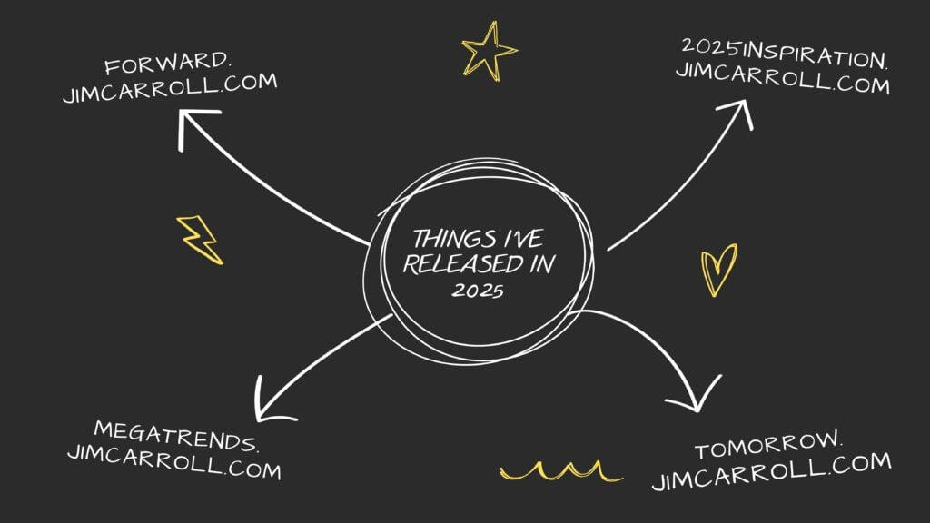 And then it starts all over again tomorrow, on Thursday, January 1, 2026 – with my “10 Great Words for 2026,” which itself began in 2006.If you haven’t signed up, join the 1/4 million who get it every day.Do so at subscribe.jimcarroll.comThere’s no doubt that there’s a lot of challenge to come in 2026, but there’s also a lot of opportunity.Opportunities become even bigger when exponential trends become a reality.But here’s the thing – it’s up to you whether you will turn it into an opportunity, or whether the challenge will bury you.It depends on the choices you make and the actions you take.But there is a dark side to velocity.If you choose to let the challenges rule, you’ll slide into mediocrity like everyone else – you’ll embrace it.But if you decide to be bold, be daring, you’ll escape it – and you’ll find it absolutely fascinating!Here’s your final chalkboard summary!