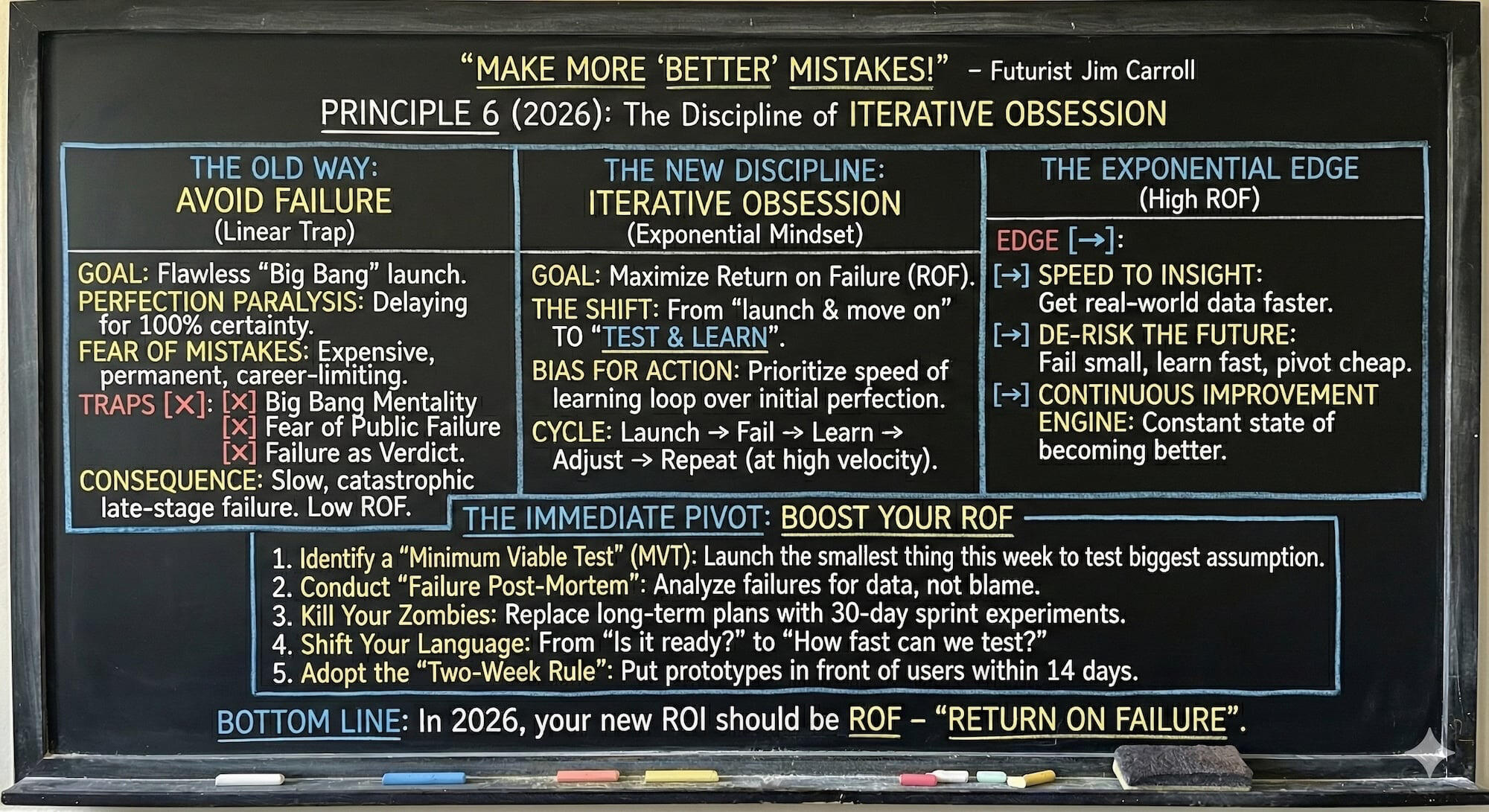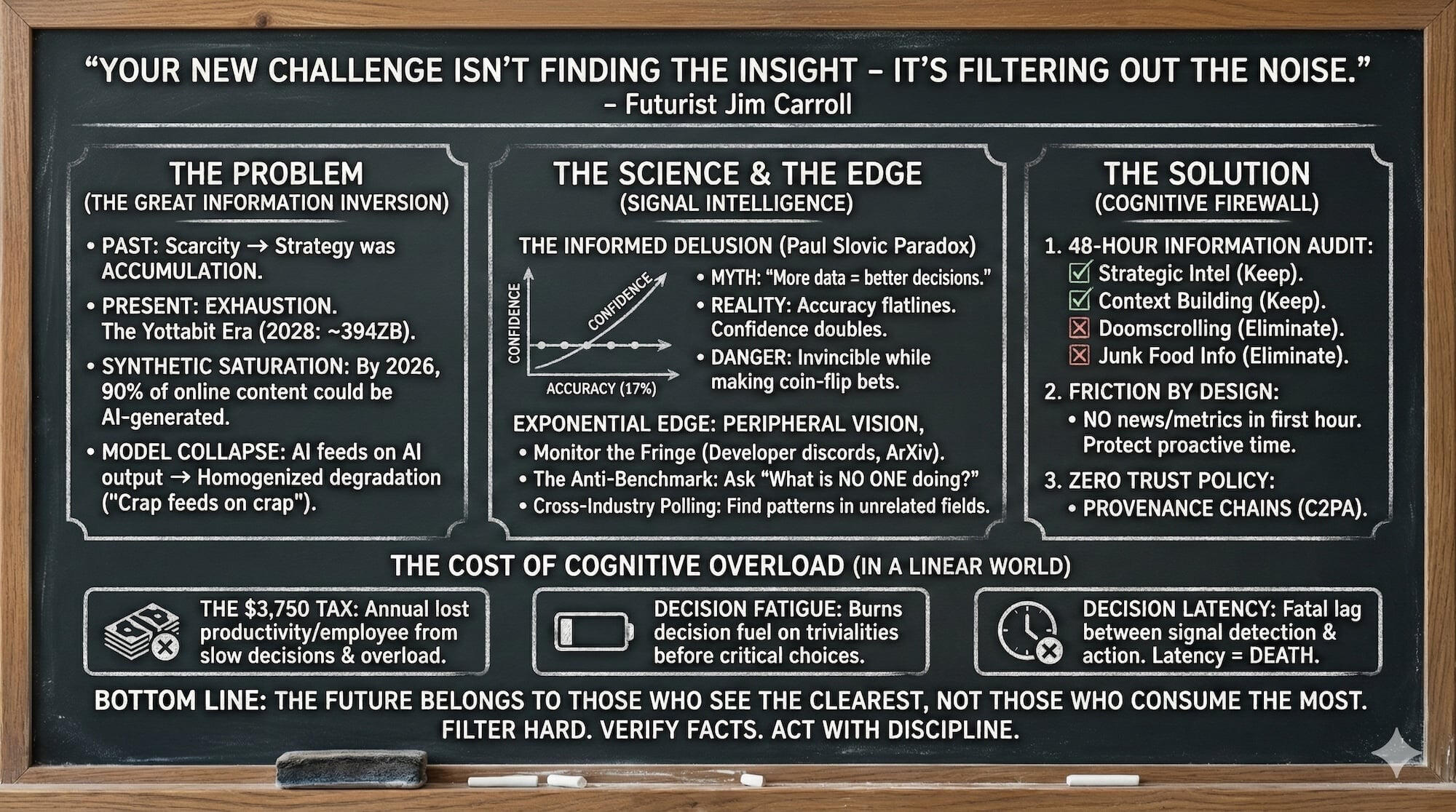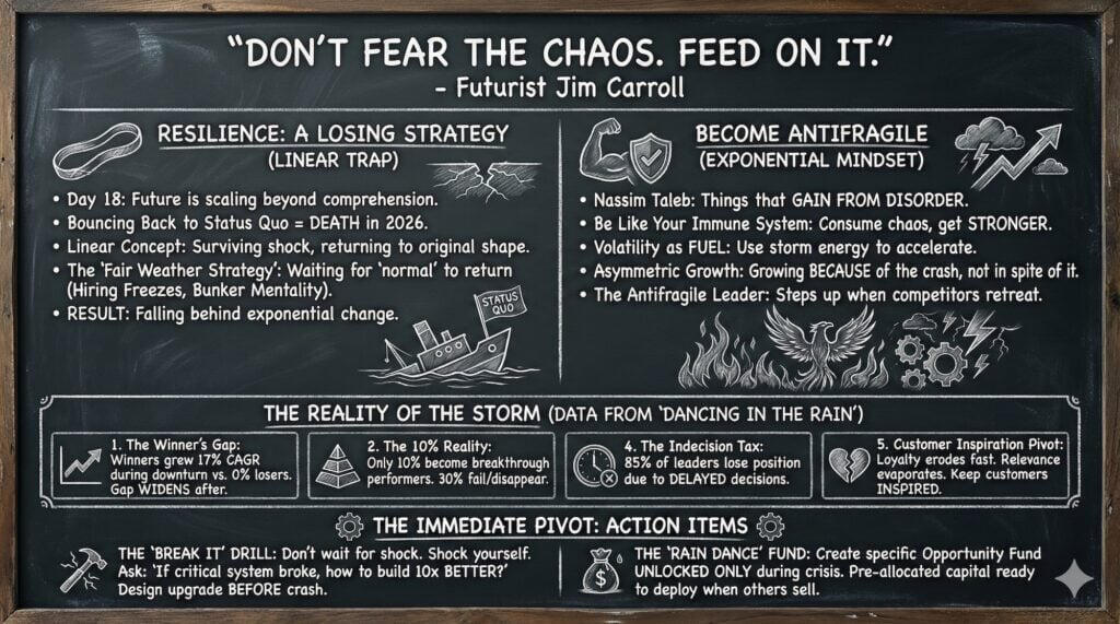 And then it starts all over again tomorrow, on Thursday, January 1, 2026 – with my “10 Great Words for 2026,” which itself began in 2006.If you haven’t signed up, join the 1/4 million who get it every day.Do so at subscribe.jimcarroll.comThere’s no doubt that there’s a lot of challenge to come in 2026, but there’s also a lot of opportunity.Opportunities become even bigger when exponential trends become a reality.But here’s the thing – it’s up to you whether you will turn it into an opportunity, or whether the challenge will bury you.It depends on the choices you make and the actions you take.But there is a dark side to velocity.If you choose to let the challenges rule, you’ll slide into mediocrity like everyone else – you’ll embrace it.But if you decide to be bold, be daring, you’ll escape it – and you’ll find it absolutely fascinating!Here’s your final chalkboard summary!