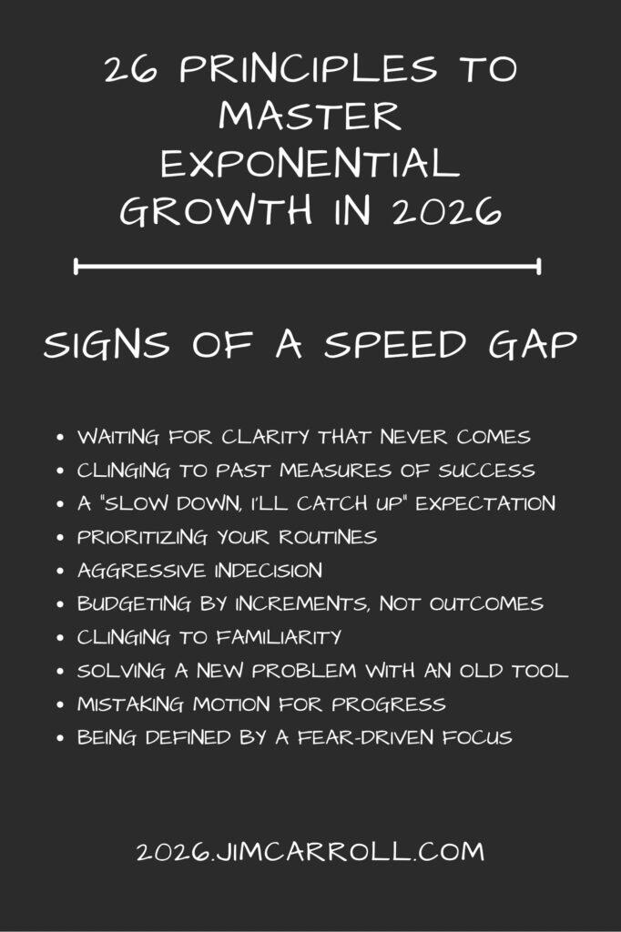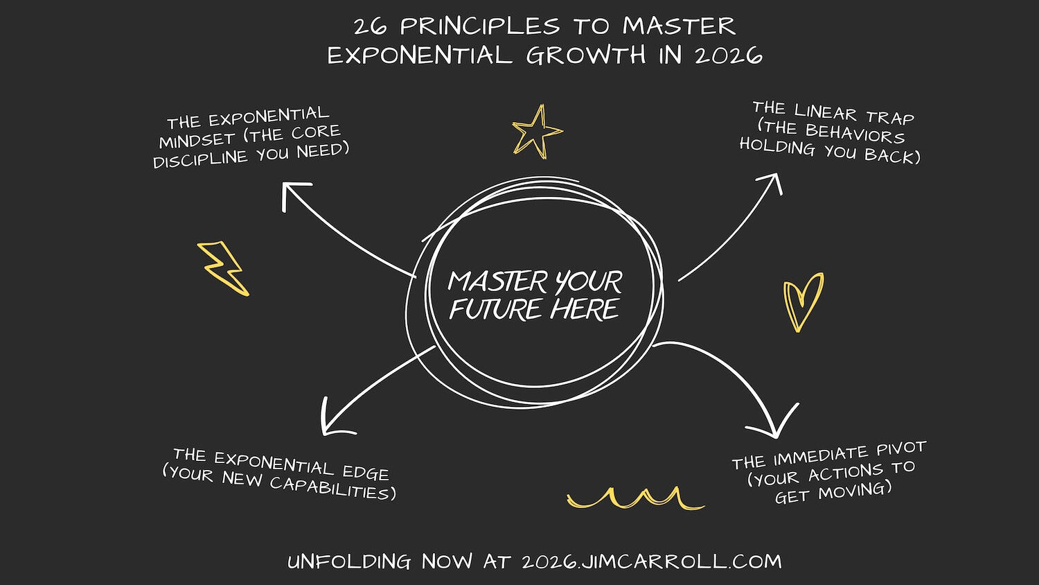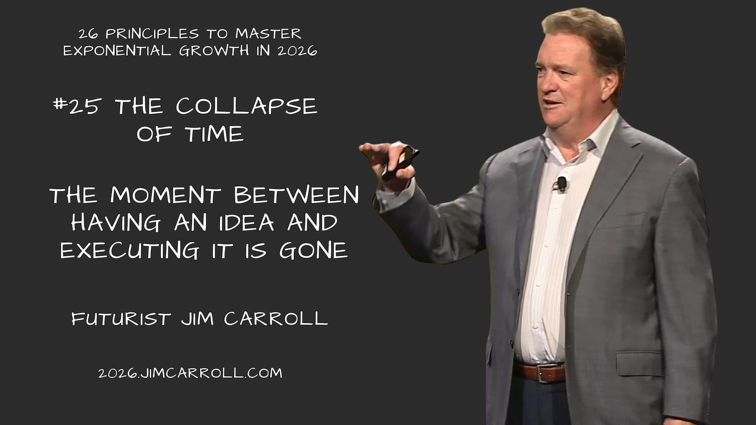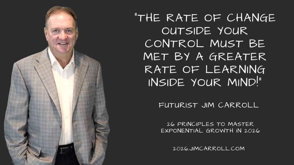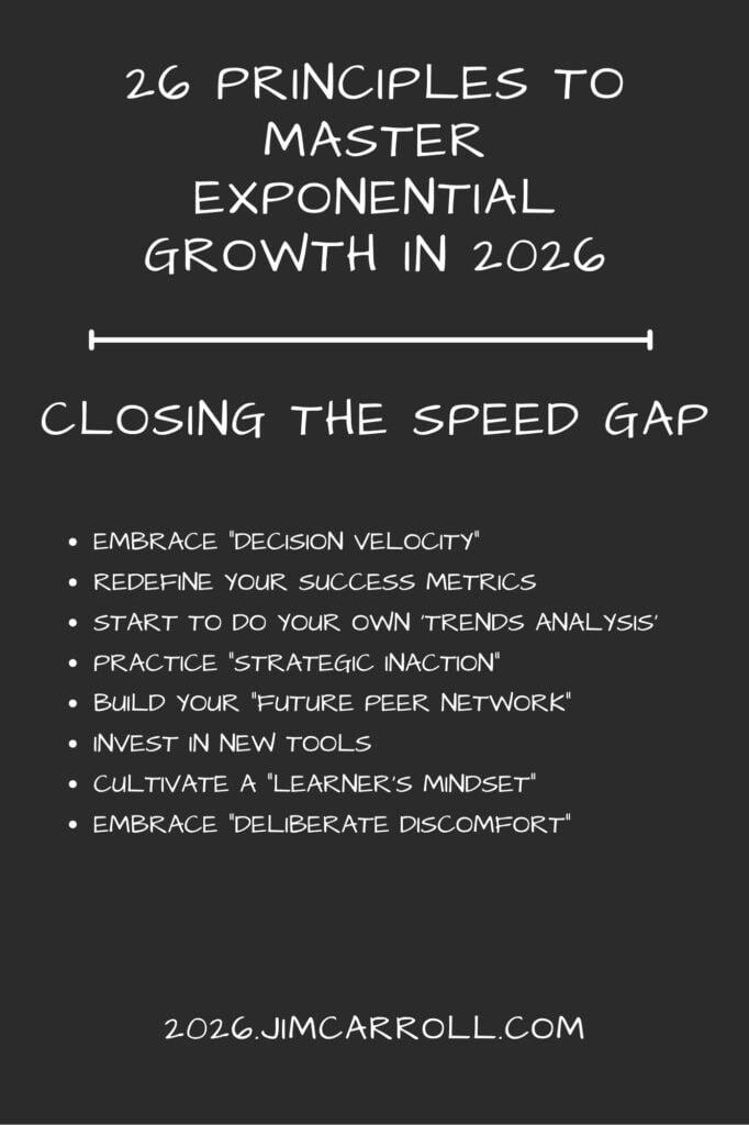 This included my 2025 motivational outlook series, which covered mindsets for a complex year (at 2025inspiration.jimcarroll.com), my Tomorrow series at tomorrow.jimcarroll.com (which became the foundation for my book, Dancing in the Rain: How Bold Leaders Grow Stronger in Stormy Times), my 30 Megatrends series at megatrends.jimcarroll.com, and the way Forward for industries at forward.jimcarroll.comFeedback? People love this stuff!And I think I like to write!And so – it’s time for 2026! It will all unfold right here, and 2026.jimcarroll.comWhat is it? Ideas and issues to get you ready for a world that continues to accelerate faster than ever before. The fact is, every trend is moving from a slow and steady acceleration to exponential acceleration, and that has profound implications on what you do, what you need to do, and how you need to think.In that context, if 2026 is the year you reinvent your career, master future-ready skills, and accelerate your impact, you need a new playbook. That’s why I’m writing these 26 Principles of Exponential Growth: Mastering 2026. Over 26 days, I’ll deliver a high-impact framework that pairs a core Discipline you must master (like Temporal Literacy) with a single, powerful Self-Reflection Question you must ask. Combined with some metrics to get you thinking, and actions you need to take to get moving.