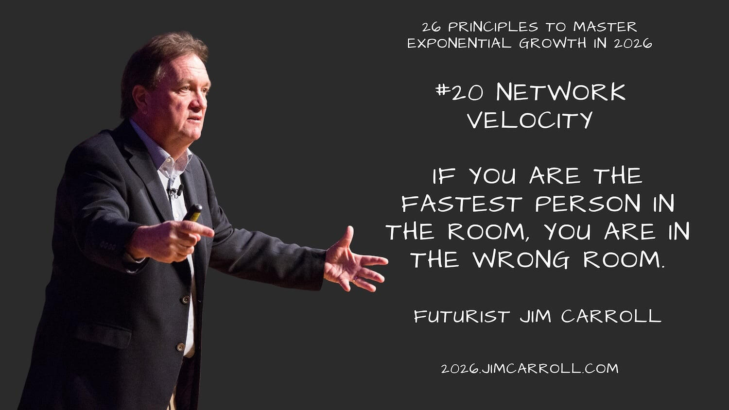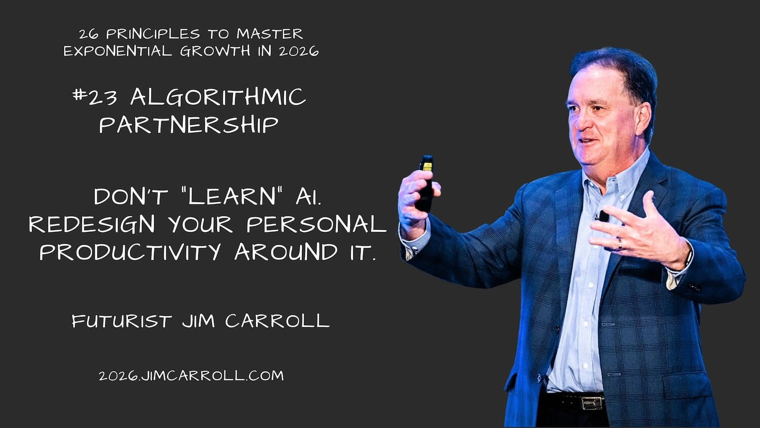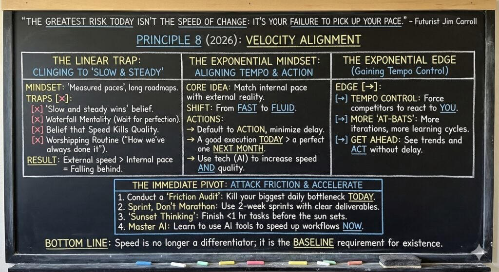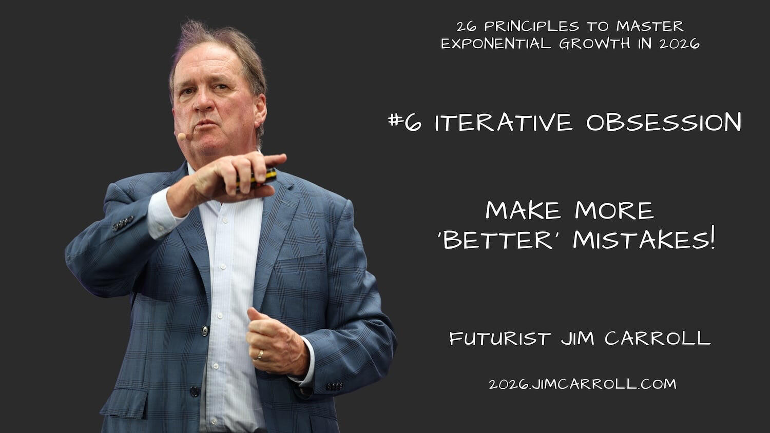 This included my 2025 motivational outlook series, which covered mindsets for a complex year (at 2025inspiration.jimcarroll.com), my Tomorrow series at tomorrow.jimcarroll.com (which became the foundation for my book, Dancing in the Rain: How Bold Leaders Grow Stronger in Stormy Times), my 30 Megatrends series at megatrends.jimcarroll.com, and the way Forward for industries at forward.jimcarroll.comFeedback? People love this stuff!And I think I like to write!And so – it’s time for 2026! It will all unfold right here, and 2026.jimcarroll.comWhat is it? Ideas and issues to get you ready for a world that continues to accelerate faster than ever before. The fact is, every trend is moving from a slow and steady acceleration to exponential acceleration, and that has profound implications on what you do, what you need to do, and how you need to think.In that context, if 2026 is the year you reinvent your career, master future-ready skills, and accelerate your impact, you need a new playbook. That’s why I’m writing these 26 Principles of Exponential Growth: Mastering 2026. Over 26 days, I’ll deliver a high-impact framework that pairs a core Discipline you must master (like Temporal Literacy) with a single, powerful Self-Reflection Question you must ask. Combined with some metrics to get you thinking, and actions you need to take to get moving.