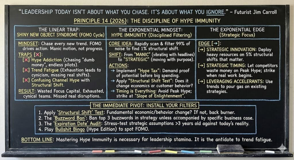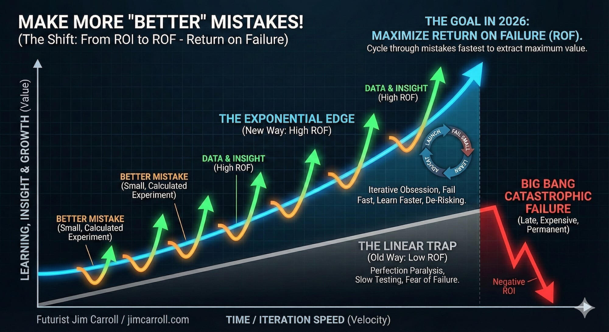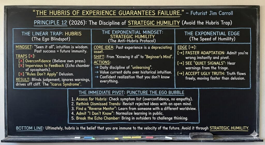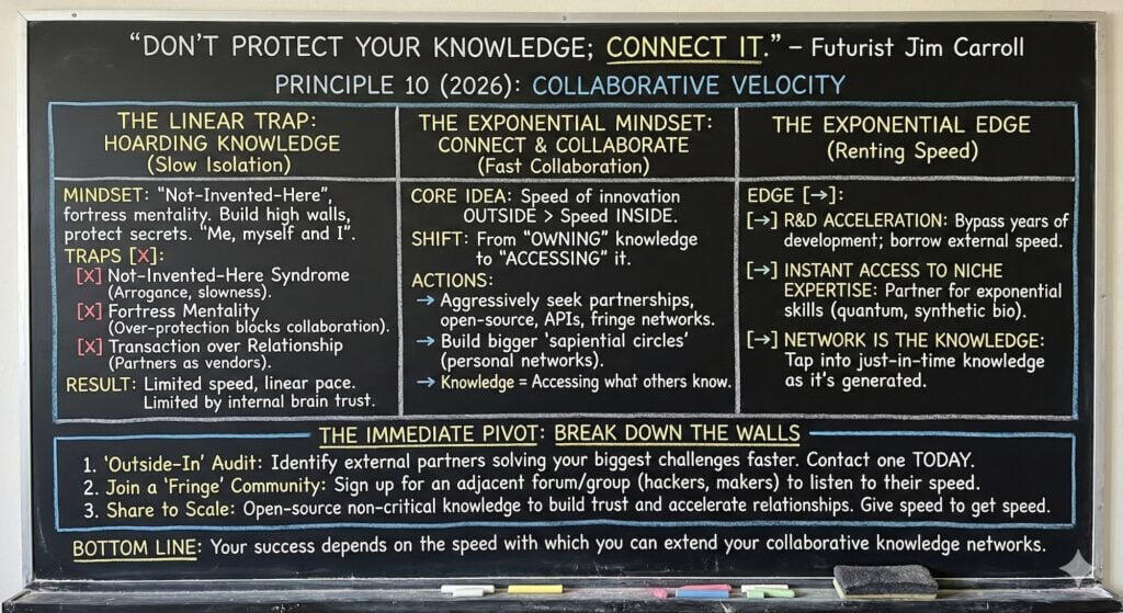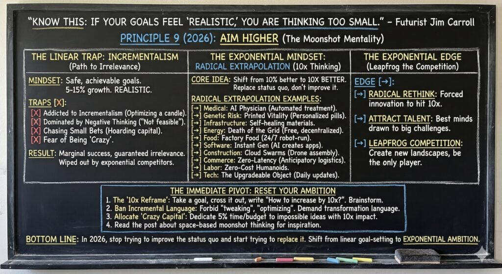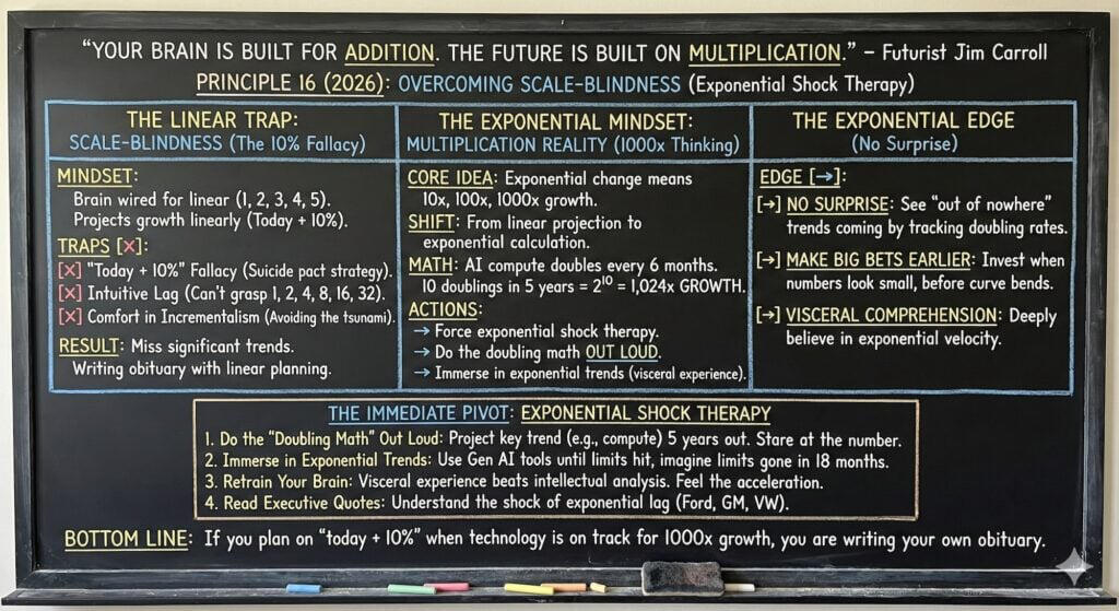 This included my 2025 motivational outlook series, which covered mindsets for a complex year (at 2025inspiration.jimcarroll.com), my Tomorrow series at tomorrow.jimcarroll.com (which became the foundation for my book, Dancing in the Rain: How Bold Leaders Grow Stronger in Stormy Times), my 30 Megatrends series at megatrends.jimcarroll.com, and the way Forward for industries at forward.jimcarroll.comFeedback? People love this stuff!And I think I like to write!And so – it’s time for 2026! It will all unfold right here, and 2026.jimcarroll.comWhat is it? Ideas and issues to get you ready for a world that continues to accelerate faster than ever before. The fact is, every trend is moving from a slow and steady acceleration to exponential acceleration, and that has profound implications on what you do, what you need to do, and how you need to think.In that context, if 2026 is the year you reinvent your career, master future-ready skills, and accelerate your impact, you need a new playbook. That’s why I’m writing these 26 Principles of Exponential Growth: Mastering 2026. Over 26 days, I’ll deliver a high-impact framework that pairs a core Discipline you must master (like Temporal Literacy) with a single, powerful Self-Reflection Question you must ask. Combined with some metrics to get you thinking, and actions you need to take to get moving.