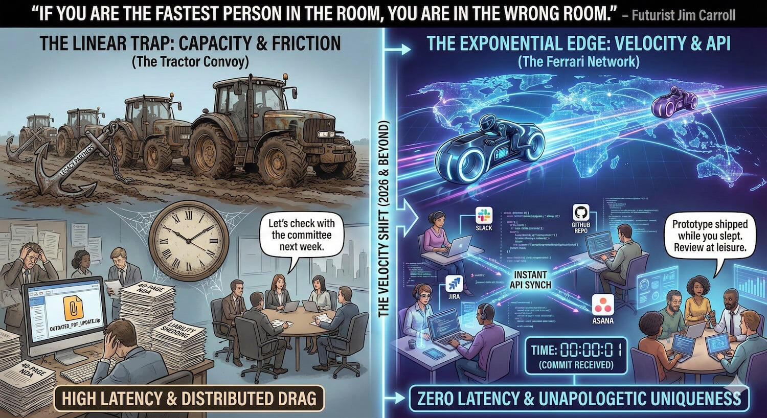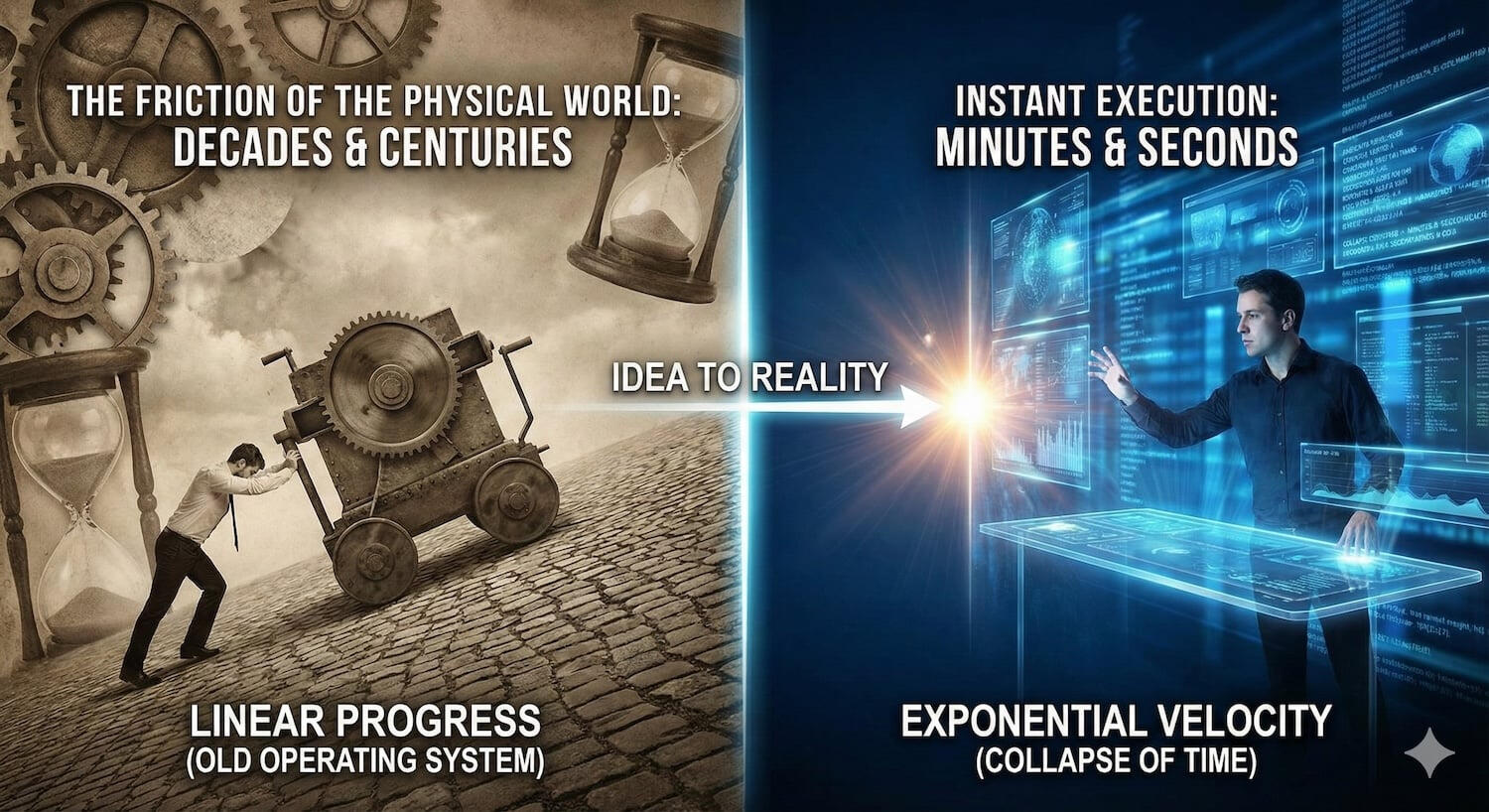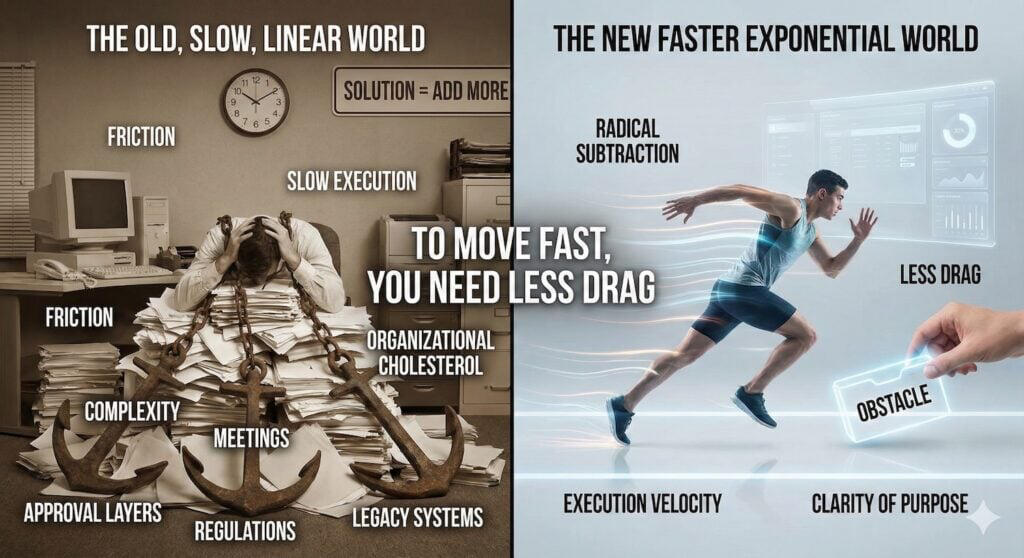 All of these developments are occurring all around you at a staggering speed. The future doesn’t just belong to those who are fast anymore – it is leaving behind those who aren’t speeding up. In that reality, the discipline you must master is responding to the Collapse of Time.1. The Exponential MindsetThe Exponential Mindset understands that we have moved from the “Era of Creation” (which takes time) to the “Era of Instantaneity” (which takes the ability to use new tools to do things faster)In this reality, when the cost of doing the work hits zero, and the time to do the work hits zero, the only value left is the quality of the question you ask. Prompting. Prompt engineering. Learning how to talk to the machine.In that way, you are no longer a “builder.” You are an “architect of the instant.”2. The Linear TrapLinear leaders are addicted to moving slowly. They rely on long development cycles to hide their indecision. They hold meetings to build consensus. They seek reports to justify decisions. They use “production time” as an excuse to delay the strategy.They build 5-year roadmaps for technologies that change in 5 months!In 2026, lag is a liability; waiting is an anchor; pausing is perilous.If you are relying on the “time it takes to build” to protect your market share, you are already dead. While you are holding committee meetings to approve the prototype, your competitor has already conceived of the final product and is selling it.3. The Exponential EdgeWhen you master the Collapse of Time, you unlock the value occurring in an exponential world.