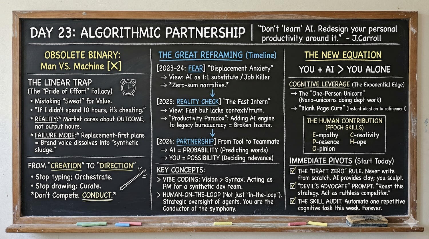 Become a “Partnership Operator”: Scale your output by orchestrating AI agents rather than doing the work.