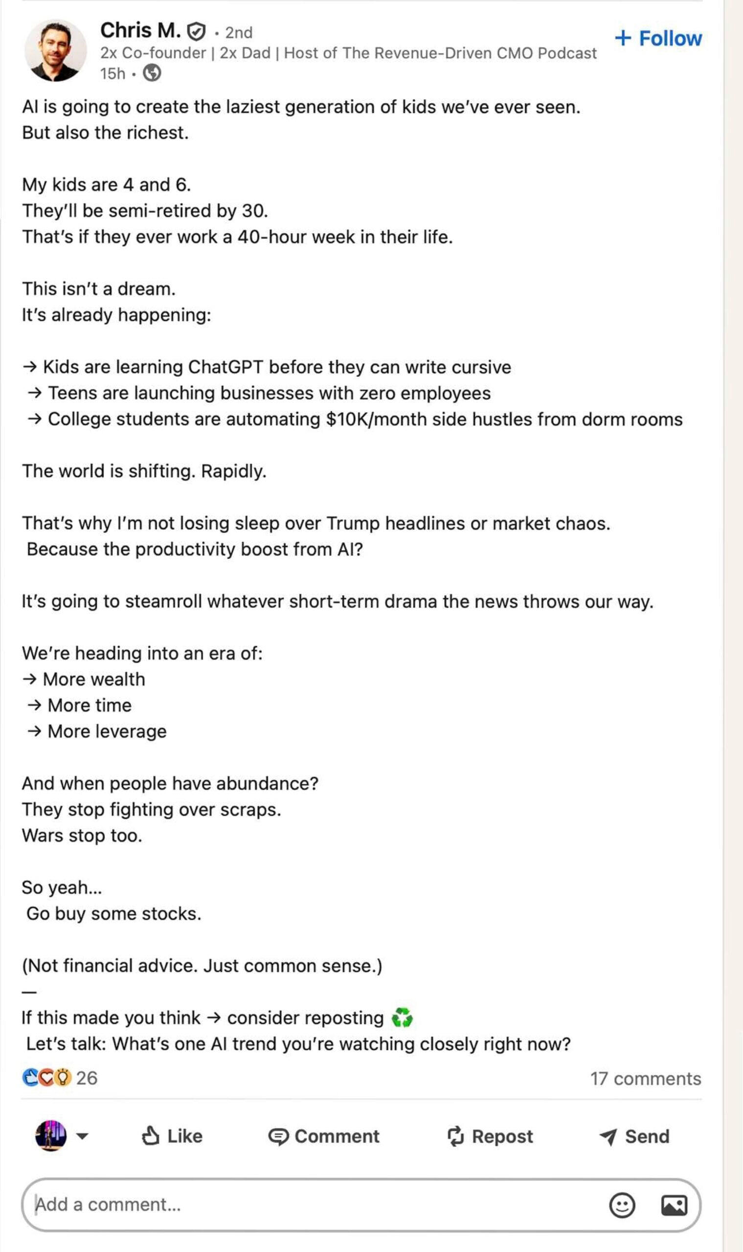 Here’s what you need to think about.1. The Exponential MindsetThe trap many leaders fall into today isn’t just moving too slow – it’s trying to be fast on the wrong things.We are living in an exponential reality. But remember: exponentiation works on negative numbers too. If you automate a flawed process, you kill your business exponentially faster. If you use AI to scale a boring marketing message, you just annoy more people in less time. If you learn to use AI to focus on the wrong skills, you’ll get the wrong knowledge.The mindset shift here isn’t about speed; it’s about goals. You must stop asking “How can we do this faster?” and start asking “Is this worth doing at all?”2. The Trend: The Death of ‘Average.’Why is mediocrity suddenly fatal? Because the barrier to entry for “average” has dropped to zero.Generative AI can produce “average” copy, “average” code, and “average” strategy in seconds.