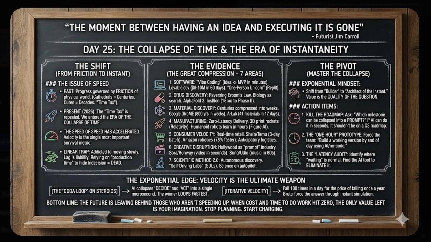 Iterative Velocity: As we discussed in Day 6 (Make Better Mistakes), the Collapse of Time allows you to fail 100 times in a day for the price of failing once a year. You don’t guess the future; you brute-force your way to the right answer through thousands of instant simulations. Vibing everything!