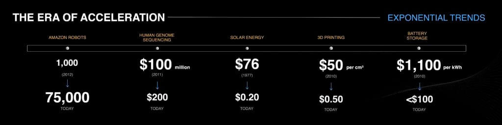 (Fair point: he has often posted about linear vs. exponential trends – this is a common idea in futurist circles).It’s best to put this into perspective in the context of the reality of trends today.A year ago this month, I was invited by the Office of the Prime Minister of the United Arab Emirates to address the annual AGM of the region – a room full of 700 cabinet ministers and government executives. We spent a lot of time polishing my slide deck, and here are a few key slides. (Forgive the small type – these were prepared for a really big room with a really big LED screen!)The first had to do with what I call ‘the era of acceleration.’
