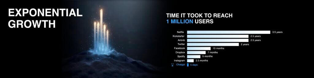 Given that it was a year ago, these numbers are already wildly out of date, particularly the number of Amazon robots!Then there is what we call ‘Global Adoption Speed’ – simply put, people and industries adapt to new trends faster. It took Netflix 3 1/2 years to reach 1 million users – it took ChatGPT 5 days.