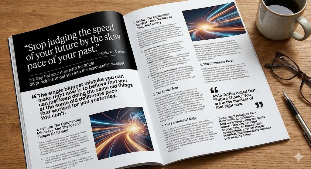 It’s Day 1 of your new path for 2026! 26 days, 26 principles to get you into the exponential mindset.Step 1? Master “Temporal Literacy” – in which you stop judging the speed of your future by the slow pace of your past!The single biggest mistake you can make right now is to believe that you can just keep doing the same old things at the same old deliberate pace that worked for you yesterday.You can’t.Think about it – your past career success, your accumulated knowledge, and your daily routine have all been built on a ‘linear’ world – one that involves a slow, steady and expected rate of change. That’s gone. The world is accelerating exponentially, creating a massive Temporal Lag between the speed you move and the speed the world demands.