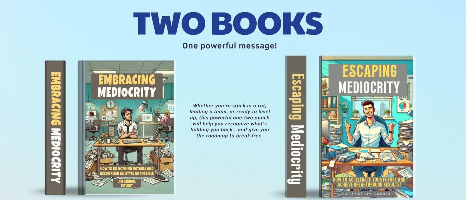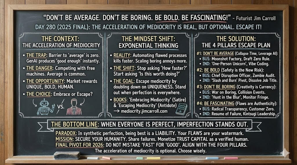 Escape the trap of mediocrity!The acceleration of mediocrity is real, but it is optional. You have the playbook.Now you just need the mindset.For a deeper dive into the strategies that will define the winners of 2026, you need the full manual.Whether you need the antidote to average or a satirical look at what to avoid, grab your copies of “Escaping Mediocrity“ and “Embracing Mediocrity“ today.Get them now at mediocrity.jimcarroll.com