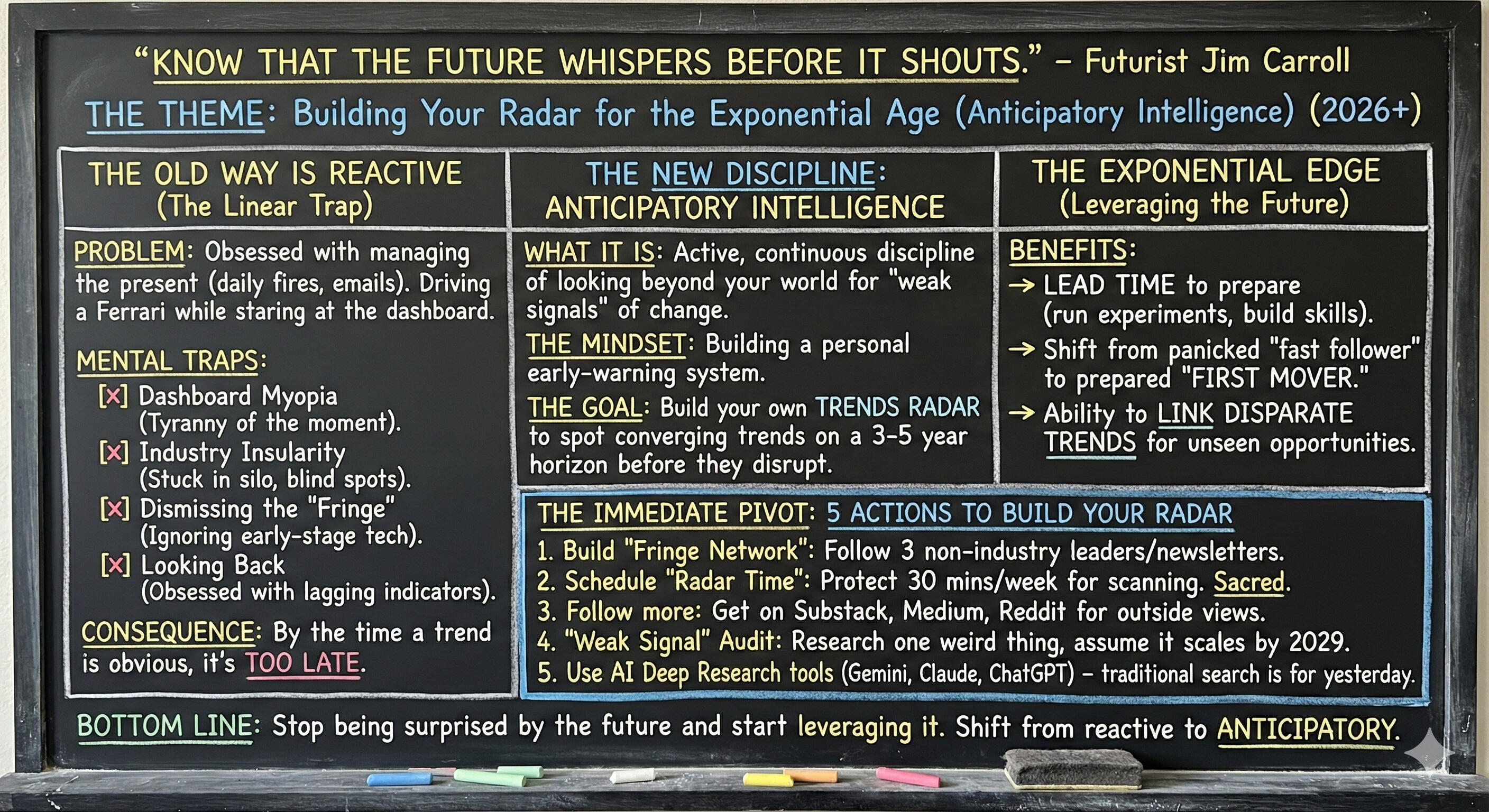 This included my 2025 motivational outlook series, which covered mindsets for a complex year (at 2025inspiration.jimcarroll.com), my Tomorrow series at tomorrow.jimcarroll.com (which became the foundation for my book, Dancing in the Rain: How Bold Leaders Grow Stronger in Stormy Times), my 30 Megatrends series at megatrends.jimcarroll.com, and the way Forward for industries at forward.jimcarroll.comFeedback? People love this stuff!And I think I like to write!And so – it’s time for 2026! It will all unfold right here, and 2026.jimcarroll.comWhat is it? Ideas and issues to get you ready for a world that continues to accelerate faster than ever before. The fact is, every trend is moving from a slow and steady acceleration to exponential acceleration, and that has profound implications on what you do, what you need to do, and how you need to think.In that context, if 2026 is the year you reinvent your career, master future-ready skills, and accelerate your impact, you need a new playbook. That’s why I’m writing these 26 Principles of Exponential Growth: Mastering 2026. Over 26 days, I’ll deliver a high-impact framework that pairs a core Discipline you must master (like Temporal Literacy) with a single, powerful Self-Reflection Question you must ask. Combined with some metrics to get you thinking, and actions you need to take to get moving.